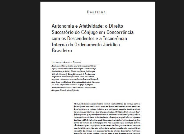 [Artigo] Autonomia e Afetividade: o Direito Sucessório do Cônjuge em Concorrência com os Descendentes e a Incoerência Interna do Ordenamento Jurídico Brasileiro